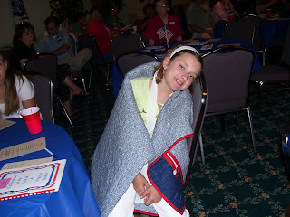 Last weekend they held a public celebration in Powhatan to recognize Armed Forces Day, gathering supplies to send to the VA National Guard members deployed to Iraq. (They were covering all of the postage as well.) So I headed out there with Sam to see the humvee and troop carrier they had on display. While we were there, a woman from Arlington, VA, happened to be driving by the sign and stopped to see what the festivities were all about. As it turns out, she herself had lost her husband in Iraq last June, but the ladies at VMQP had been unable to locate her address to contact her and offer her a quilt.