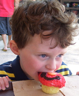 Then we took the skyride/gondola over the park, flying over the grazing sheep and goats of Ireland with its thatched roofs. And voila, we got off in France! There were no in-flight snacks, but the cheap airfare and lack of jet lag was much appreciated! Daddy Mac and I were in heaven since we both love French food, wine, culture, etc. However, the little dude was not having it since it was lunch time and there was not a deep-fried nugget to be found in any bistro there. We stumbled upon the Smokehouse and had some great BBQ and an Elmo cupcake to re-energize the Saminator.