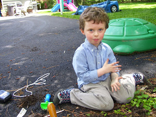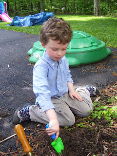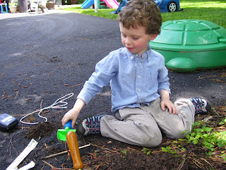 Before I knew it, we were out there digging away, Sam with his plastic shovel, which was a toy that came with his latest Chick Fil-A kids’ meal. I had my metal hand shovel, at least for a while. Eventually Sam wised up that the toy shovel, although cute, was not going to unearth dinosaur bones to fill a museum anytime soon. (Neither was my hand shovel, but it at least seemed more likely, which it probably was!)