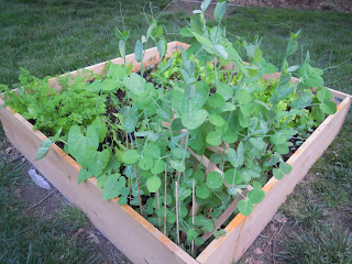 These sugar snap peas are incredibly tall and grow about an inch a day it seems.  Here they are growing these tiny tendril wispy thingies that connect to the other pea plants so they can help prop each other up.  Now that’s what I call teamwork!  Mother Nature sure was clever on that one!  Tonight we even had a normal-sized salad with lettuce from the garden and even some to spare.  That is amazing!  After harvesting the “crop” as Sam calls it, I made sure to eat every perky little leaf!  Plus I can fully attest to no pesticides!  100% organic, baby!