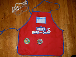 Even better, the Saminator has an adorable kid-sized Lowes work apron and mini safety goggles of his very own. The kids also get a special badge for each project they do, so Sam is up to two now and proud as can be. After wrestling with a hotel sewing kit trying to get them on the dang apron, I succumbed to the pressure. From the dark recesses of our back hall, I unearthed some of that stitch witchery stuff, which is basically double-sided tape. You put the tape between the patch and the apron and then iron it for a few seconds several times in a row. It melts, and – poof! – your kid thinks you’re a rock star!