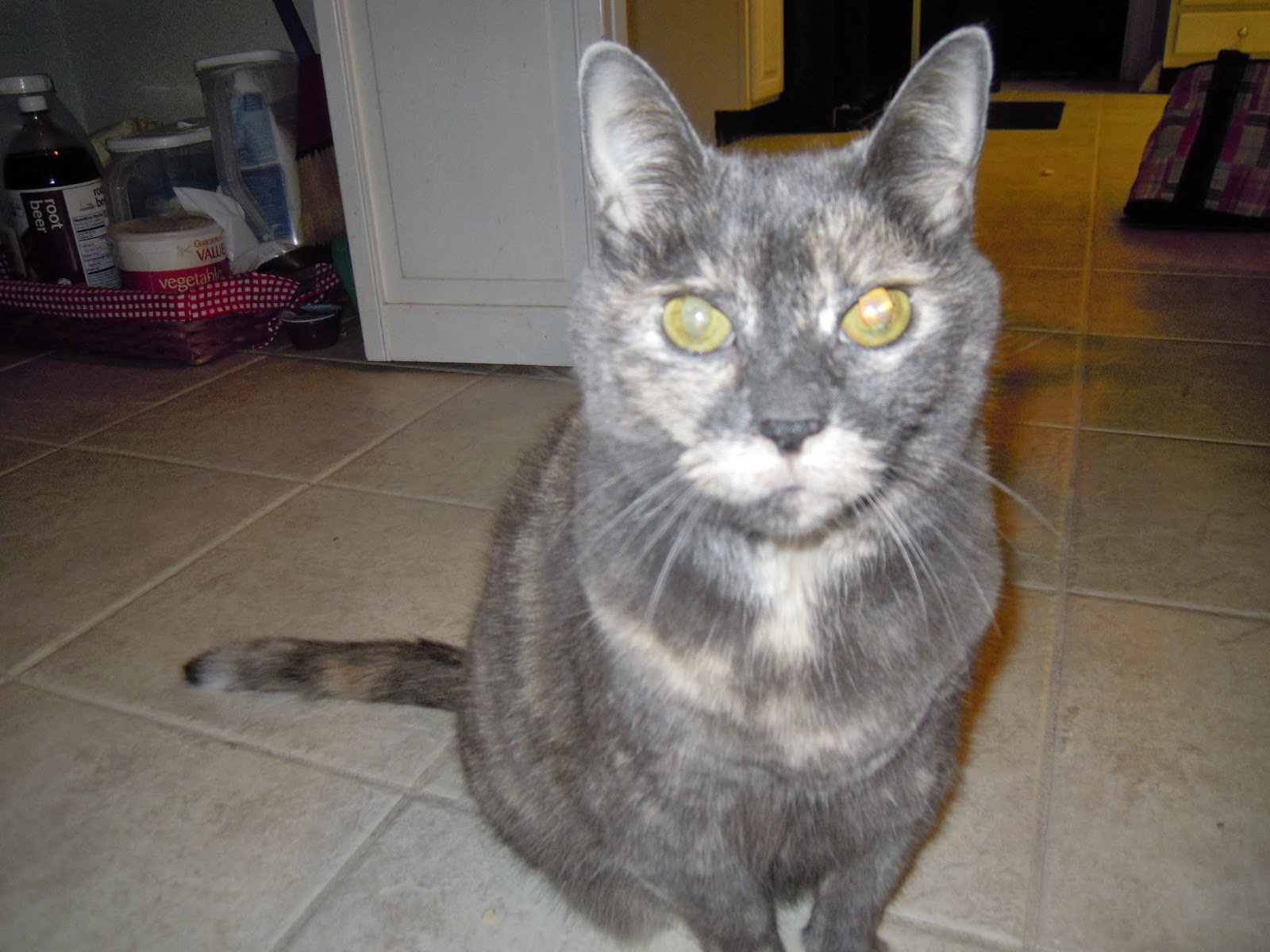 It’s pretty hilarious. She hisses at him every chance she gets, and she spends a lot of time hanging out halfway up the stairs to make it very, very uncomfortable for Cowboy to get by. It works – he cowers. And every once in a while she lunges at him — the 16-year-old cat with no claws going after a 45-pound dog. She’s sure got some cahoonas! Don’t ever try to steal her pocketbook!