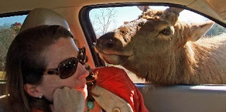 Some of these animals could use a serious facial at Elizabeth Arden or at least a Kleenex. Oy vey. Anybody got a wipe? Thankfully his massive rack of manliness made it impossible for him to poke his head inside the car. By the way Rudolph is his first cousin.