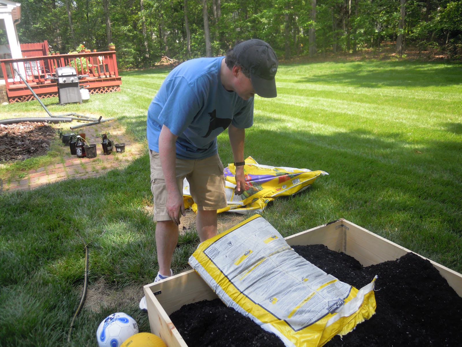 Since I’ve shared all the good news, it’s only fair to share the bad news, especially since it is due to my own knuckle-headed move.  Yes, I’ll admit it to the carnage– I accidentally massacred a whole bunch of big, healthy cucumber plants!  A gardening guru friend recommended that I move them out of the raised box because they really need to spread all over the place and the box was already overflowing.  That sure made sense.  She looked around and recommended a patch in our yard that gets great sun, so I forged ahead.  Bernie had put mulch over the area because the weeds proliferate there like crazy.  He also mentioned that he had previously put some rocks in there, too.  Well, it turns out there were TONS of rocks in there as well as some sort of layer to prevent weeds from popping up.  So no sweat, I decided to clear out some of the volcanic rocks, cut thru the protective layer, add in some top-quality dirt, and transplant.  Easy enough, huh?  Well, after a total sweat-athon, I had moved them to their new digs.  Done.  Next chore?