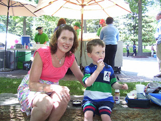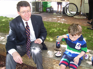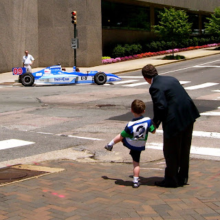 His big bad birthday bash is not until Saturday, so we got to enjoy celebrating his “real” birthday with just the “fam.” We went to meet Daddy Mac downtown in front of the James Center for a picnic on the James Center “beach.” And don’t you know it, it was just the day that a real race car from the Indy 500 was downtown Richmond, circling the block over and over again. The McNamee boys were thrilled to get a close-up view. However, a lucky few were getting actual rides. Of course the Saminator (and Daddy Mac) wanted to get a chance, but somehow I didn’t think Sam’s car seat would fit so well in the back seat. The poor driver would probably be the laughing stock of the race community if any of his cronies got wind of that scenario.